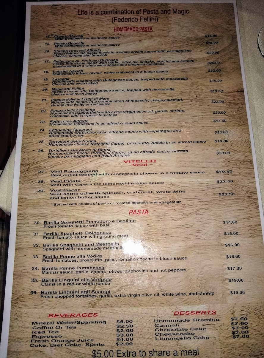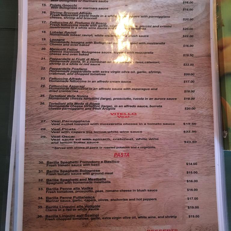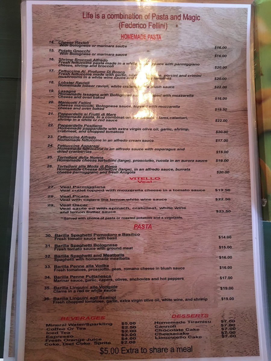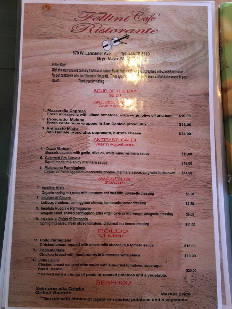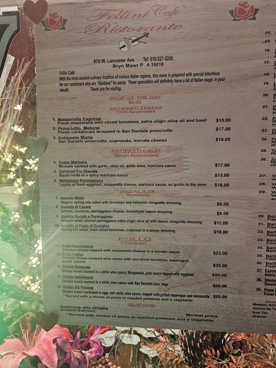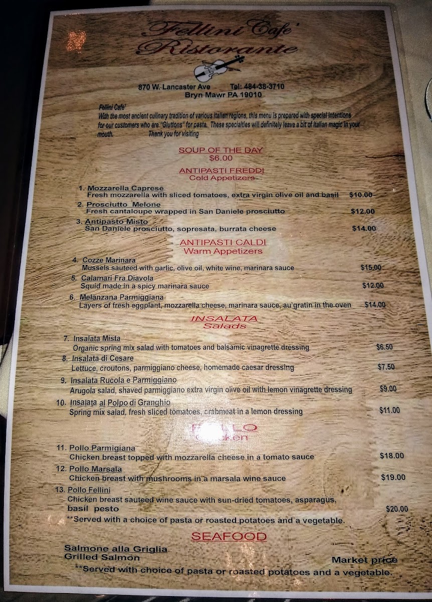 From a reviewer’s perspective, the menu at Fellini Cafe in Bryn Mawr feels like a confident celebration of classic Italian comfort, thoughtfully curated rather than overwhelming. The combination options such as Pasta Pairs: Pasta & Salad set the tone for a balanced dining experience, allowing guests to enjoy both richness and freshness in one meal. The salad selection is elegant and traditional, ranging from the peppery Insalata Rucola E Parmiggiano and the simple Insalata Mista to the more indulgent Insalata Al Polpo Di Granchio and the familiar favorite Insalata Cesare, each reinforcing the restaurant’s Mediterranean roots. Moving to the main courses, the menu truly shines with hearty, well-loved Italian dishes like Veal Parmiggiana, alongside comforting pasta classics such as Fettuccine Alfredo, Penne Puttanesca, Fettucine Alfredo With Shrimp And Broccoli, and Fettucine Asparagi, offering something for both traditionalists and seafood lovers. The appetizers provide a strong opening to the meal, with crowd-pleasers like Antipasto Misto, spicy Calamari Fra Diavola, fresh Mozzarella Caprese, savory Cozze Marinara, and the sweet-salty contrast of Prosciutto & Melone. To end on a high note, desserts such as Cannoli, Cheesecake, Limoncello Cake, Homemade Tiramisu, and Chocolate Mousse Cake round out the experience with classic Italian indulgence. Complemented by straightforward beverage choices like Espresso, Tea, Soda Water, and Cappuccino, the menu as a whole leaves a lasting impression of authenticity, comfort, and consistency-making it a satisfying conclusion to any visit at Fellini Cafe.